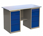 Верстак двухтумбовый поставляется в разобранном виде (4 элемента). Нагрузка на столешницу до 600 кг. Стандартный цвет: корпус - серый глянец RAL 7030, ящики и двери тумб - синий RAL 5017. Размеры:855x1400x700 мм. Масса: 107 кг.