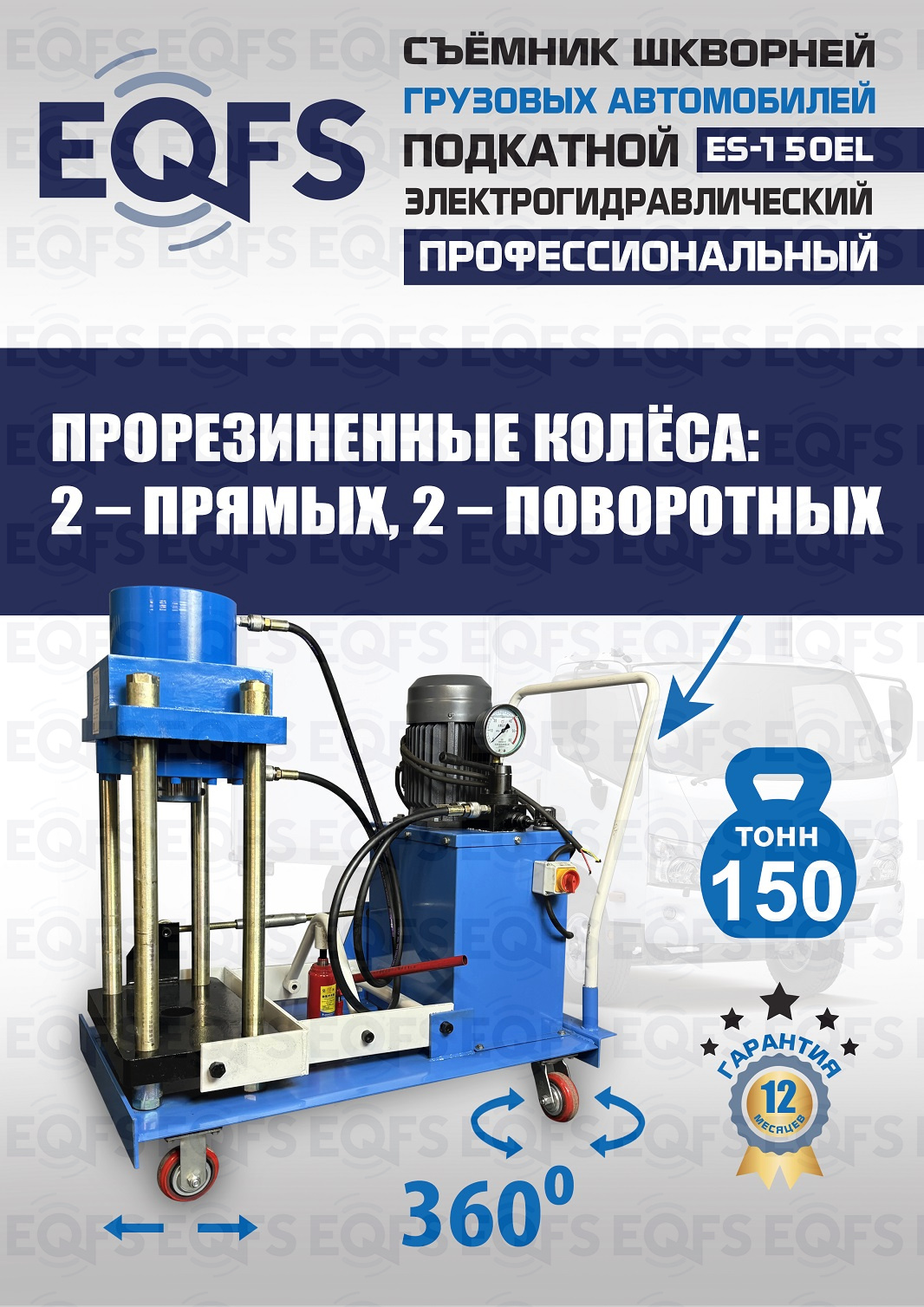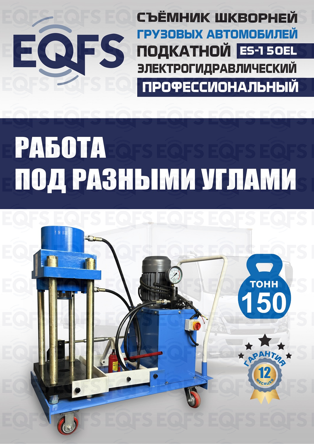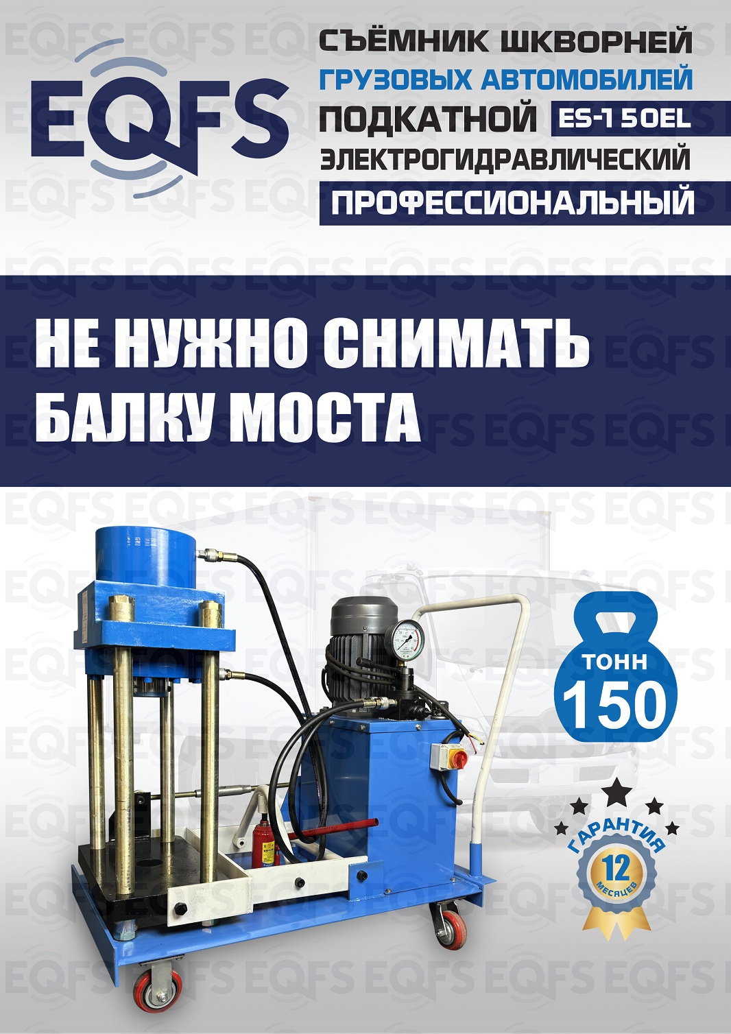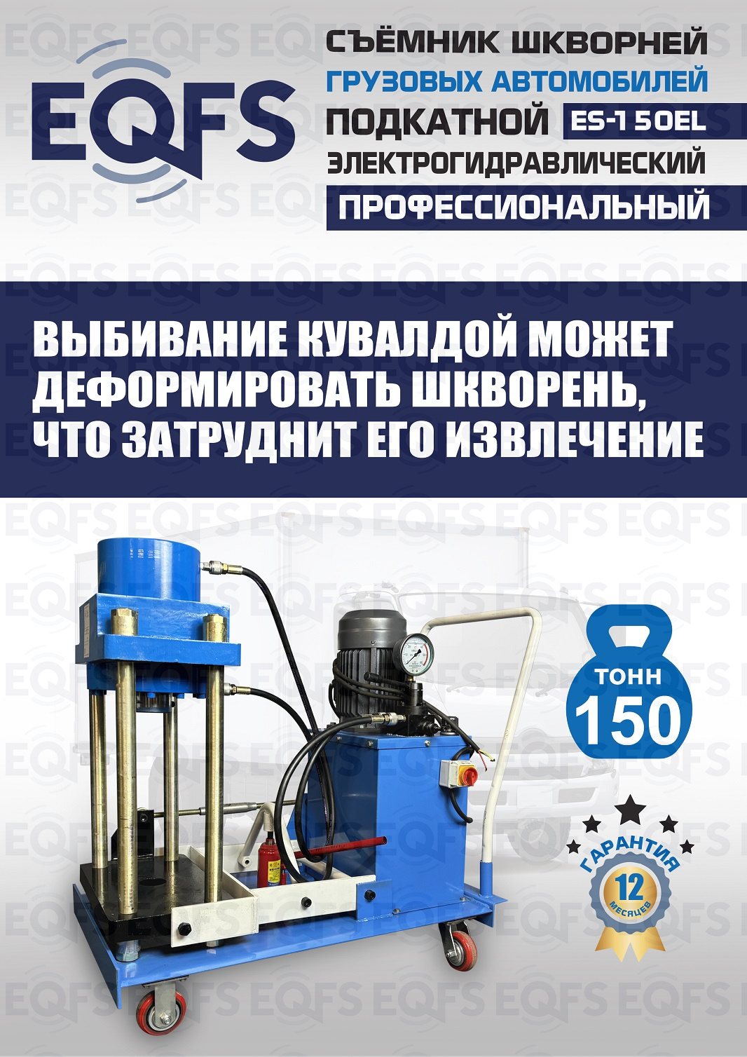 Сокращает время ремонта. Позволяет работать под разными углами 1 человеку. Мобильный. Для выпрессовки шкворней из поворотной цапфы погрузчиков, тракторов, строительной техники, коммерческих и грузовых авто отечественного и импортного производства: MAN, MERCEDES, SCANIA, VOLVO, Корейские и Китайские авто. Электрогидравлический привод. Рабочее окно 400x320 мм. Усилие 150 тонн.