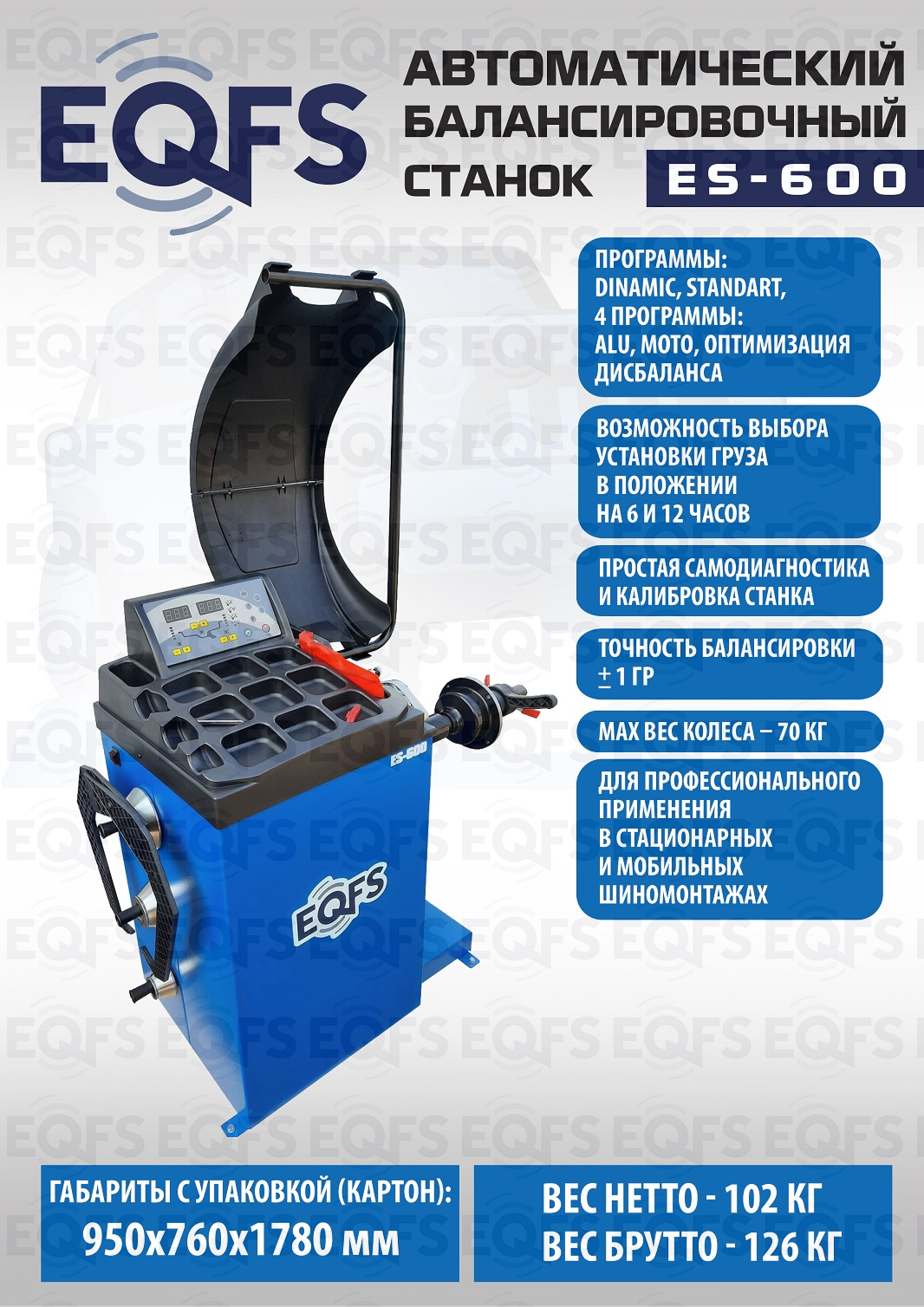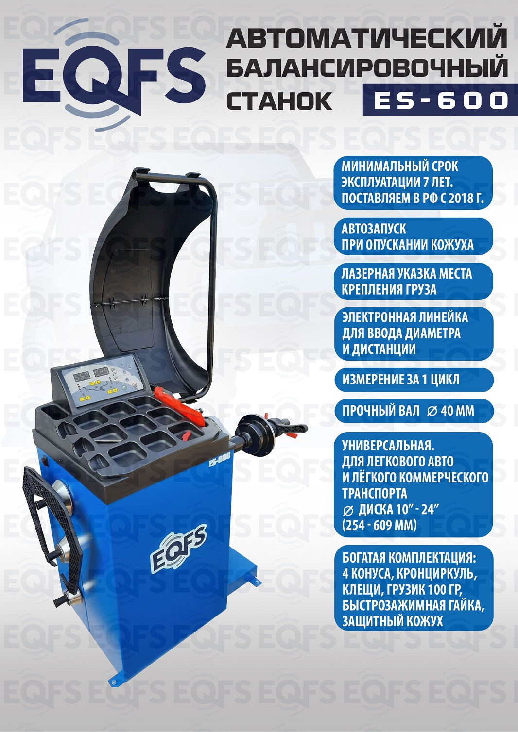 + ES-600 автоматический балансировочный станок. Удобный и понятный интерфейс. Лазерная указка места крепления груза. Режим автокалибровки. Режим самодиагностики. Для балансировки колёс легковых автомобилей, мотоциклов и лёгких грузовиков с диаметром диска с резиной до 800 мм. Размеры диска: ширина 3–10” (76-254 мм) , диаметр диска 10–24” (254÷609 мм). Прочный вал Ø - 40мм. Гарантия 18 мес – наш монтаж, 12 мес – самостоятельная установка.