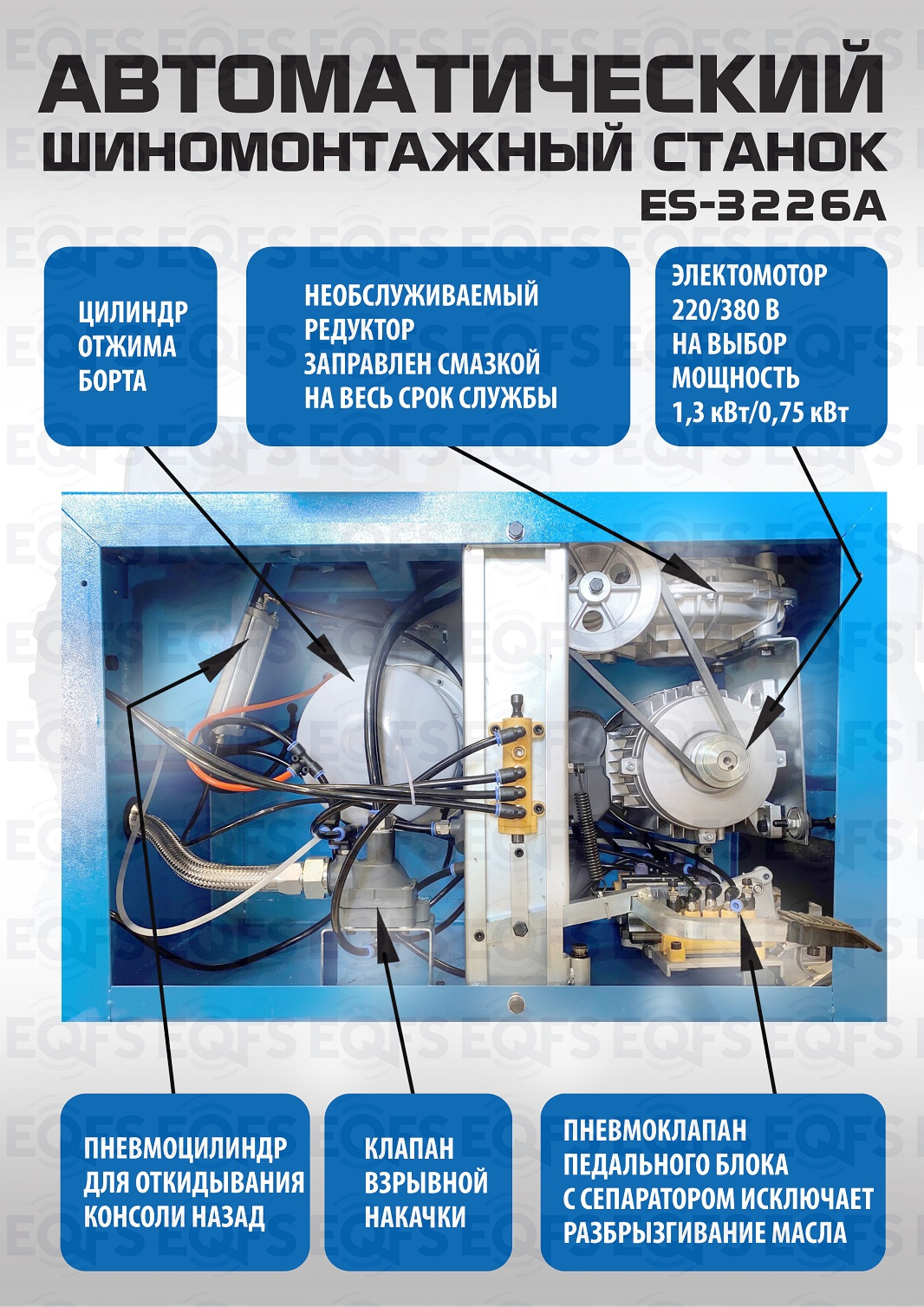 ES-3226A шиномонтажный станок Автомат. Взрывная подкачка, «третья рука» для работы с низкопрофильными шинами и RanFlat в комплекте. Диски: внешний зажим 11÷21", внутренний 12÷24". Для покрышек легковых автомобилей, внедорожников, «Спринтеров», «Газелей» и т.п.