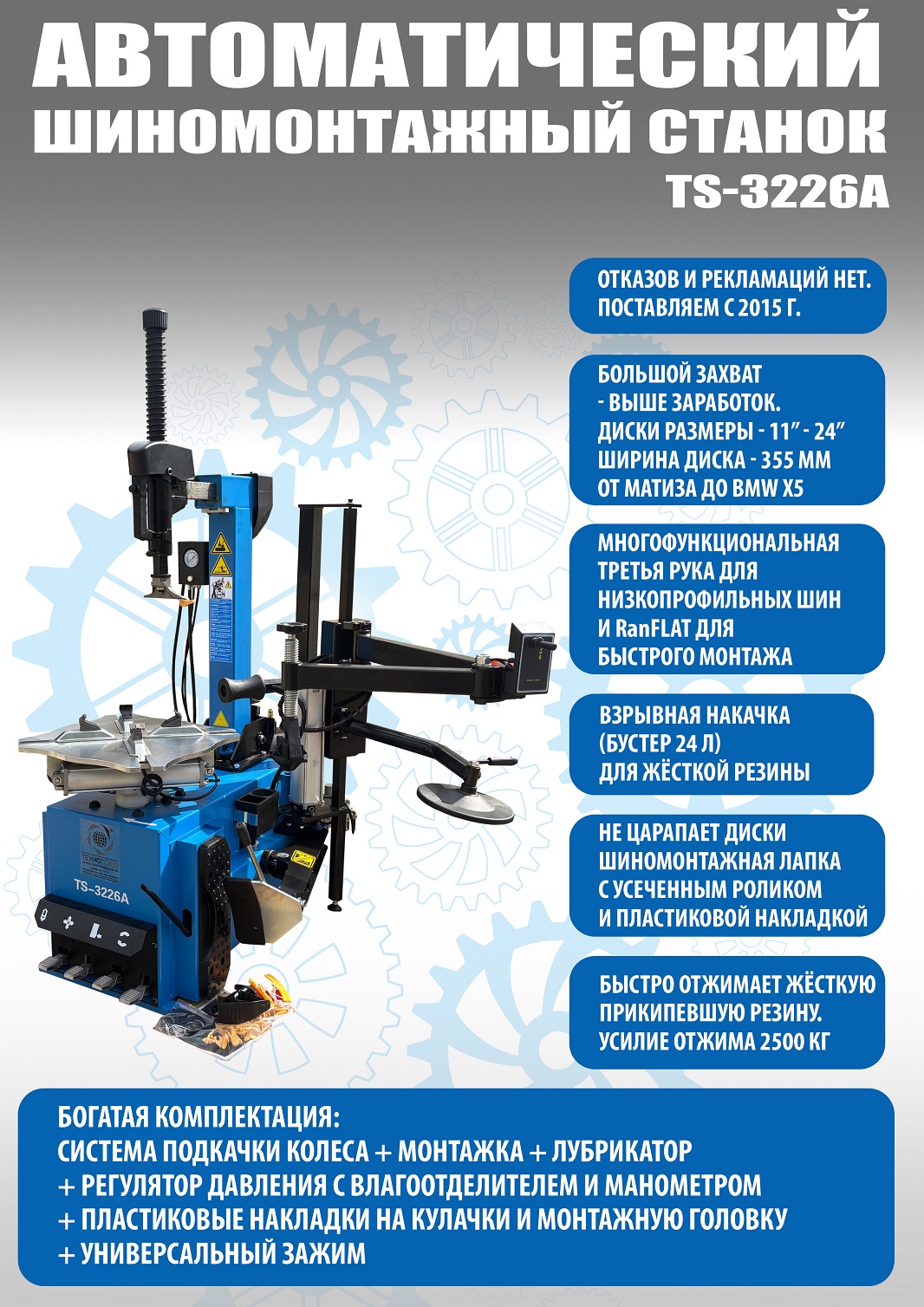 Автоматического шиномонтажного стенда TS-3226А предназначен для монтажа и демонтажа шин легковых автомобилей, внедорожников и легких грузовиков с размером колес 11-24 дюйма. Усилие пневмоцилиндра в 2500 кг. В комплекте: полноценная 3-й рука для работы с жесткой и низкопрофильной резиной RUNFLAT. + встроенный бустер 24 литра (взрывная подкачка) + пистолет для подкачки шин + монтажка + регулятор давления с влагоотделителем и манометром.