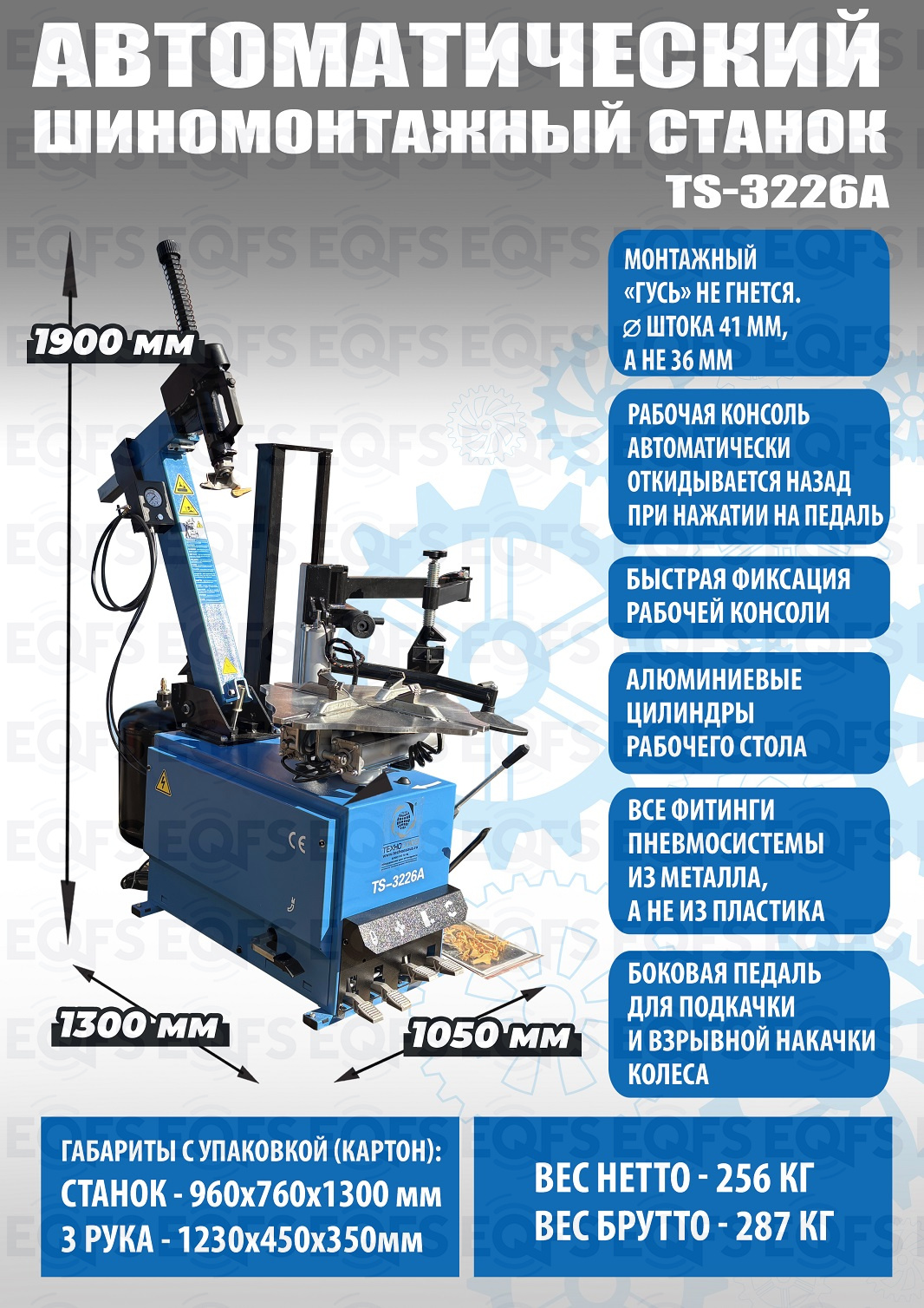 Автоматического шиномонтажного стенда TS-3226А предназначен для монтажа и демонтажа шин легковых автомобилей, внедорожников и легких грузовиков с размером колес от 11-24 дюйма. Усилие пневмоцилиндра в 2500 кг. В комплекте: полноценная 3-я рука для работы с жесткой и низкопрофильной резиной RUNFLAT. + встроенный бустер 24 литра (взрывная подкачка) + пистолет для подкачки шин + монтажка + регулятор давления с влагоотделителем и манометром. Напряжение шиномонтажных станков 220В или 380В на выбор. Гарантия 18 мес – наш монтаж, 12 мес – самостоятельная установка.